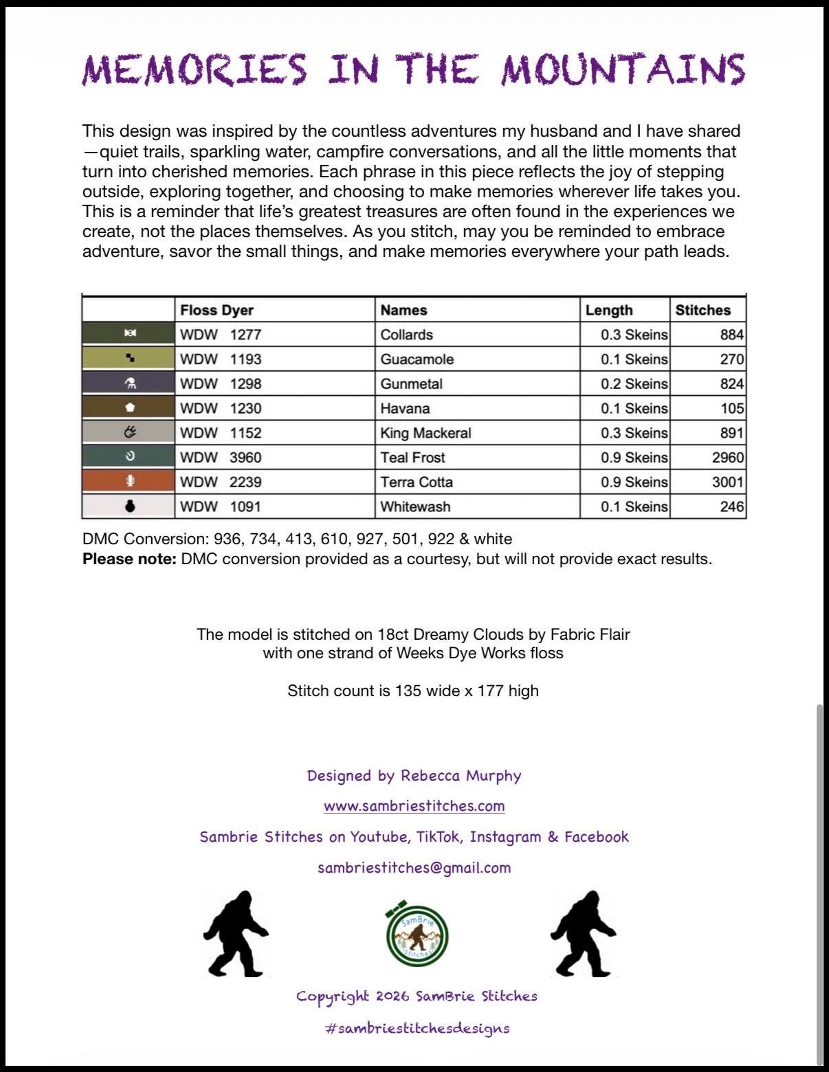 Memories in the Mountains is a heartfelt cross stitch design inspired by the countless outdoor adventures my husband and I have shared — quiet forest trails, sparkling mountain lakes, campfire conversations, and all the small moments that become treasured memories.