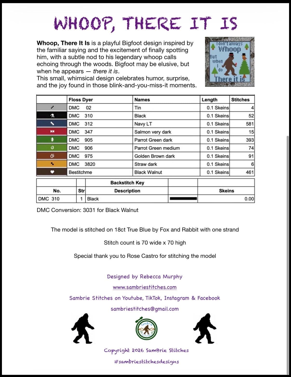 Whoop, There It Is is a playful Bigfoot-themed cross stitch design inspired by the excitement of finally spotting the legendary Sasquatch. With a nod to his famous whoop calls echoing through the woods, this fun design captures the humor and surprise of that blink-and-you-miss-it moment when Bigfoot suddenly appears… and there it is!