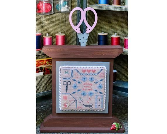 The model is shown finished on the Spool & Scissors wooden finishing piece by Paisleys and Polka Dots (sold separately). These finishing pieces come unfinished and include step-by-step instructions for easy finishing.