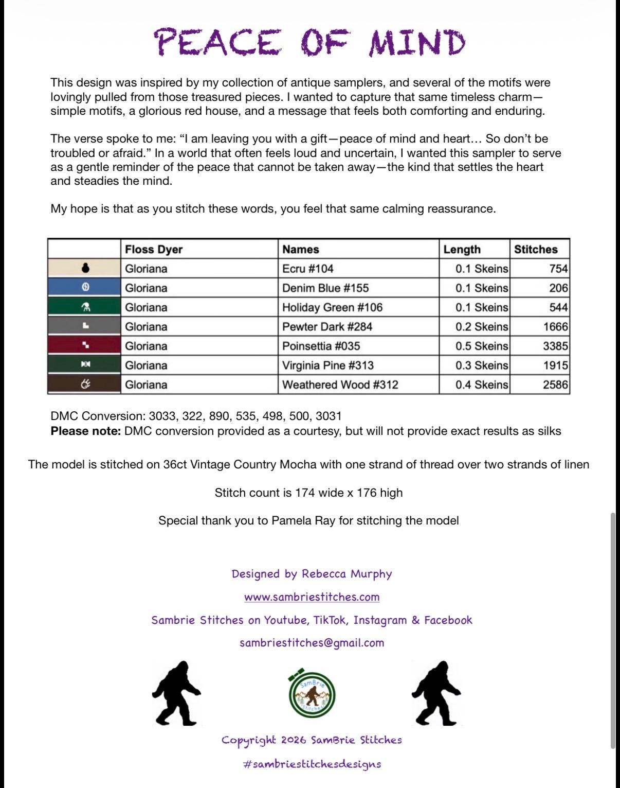 Peace of Mind is a timeless sampler-style cross stitch pattern inspired by antique samplers and the quiet beauty of traditional needlework. Several of the motifs were lovingly drawn from treasured antique pieces, capturing the charm and warmth that makes historic samplers so special.