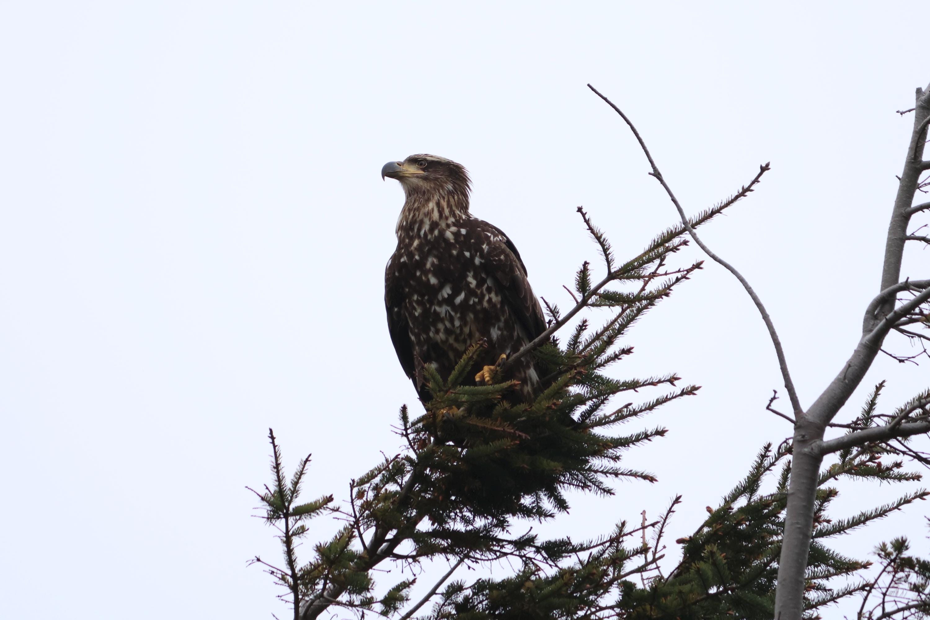Photographed in Washington State, this juvenile bald eagle perched among the treetops created a striking contrast against the soft, overcast sky—one of those quiet, fleeting moments that make every adventure worthwhile.